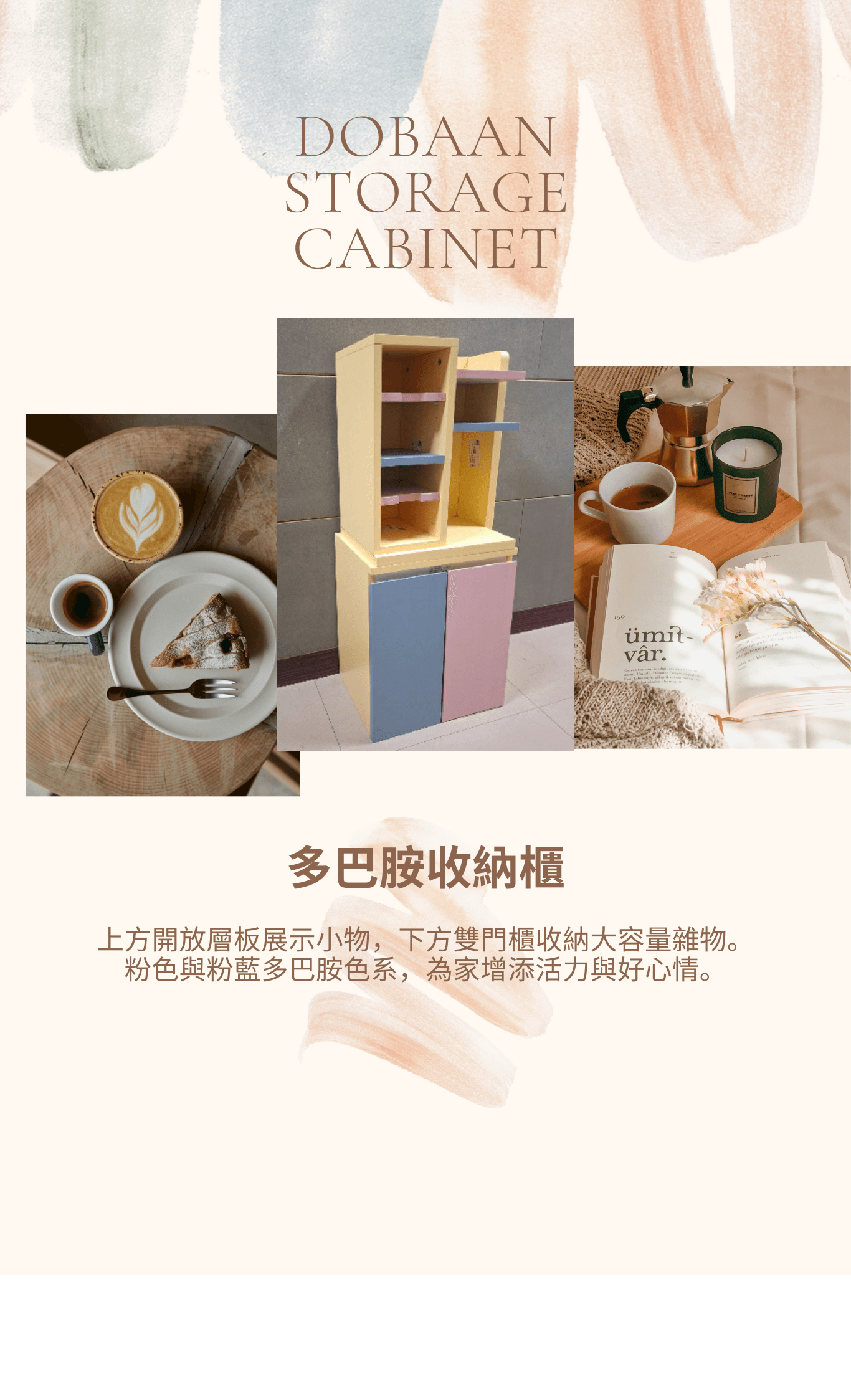 採用活潑的多巴胺色系,粉色與粉藍的搭配讓家居角落充滿活力。上方開放層板可自由陳列心愛小物或書籍,下方雙門櫃提供大容量隱藏空間,整齊收納更輕鬆,兼具趣味與實用。